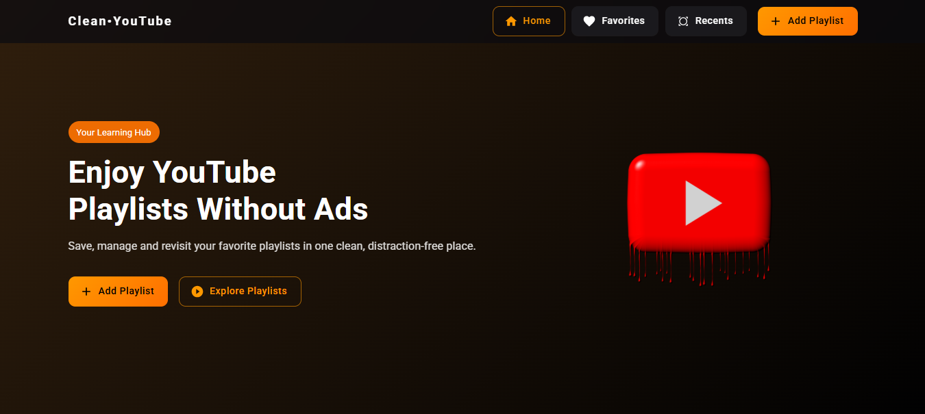 Clean YouTube is a React-based web application designed to enhance your YouTube video-watching experience by providing a clean, ad-free, and distraction-free interface. Users can efficiently manage playlists, track recent activities, and save their favorite playlists for a seamless and enjoyable experience.