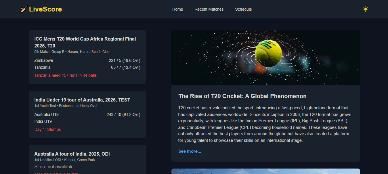 Live Cricket Score App is a Next.js application powered by the Cricbuzz API, offering real-time cricket updates with a clean and responsive UI. It keeps users engaged with live scores, recent results, upcoming fixtures, and cricket articles. A detailed scorecard section provides in-depth match insights for a complete experience.